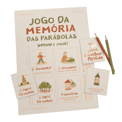 Cartinhas coloridas com nomes e símbolos das parábolas para recortar, brincar e memorizar o conteúdo bíblico com alegria.